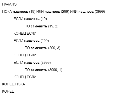 В результате выполнения цикла программы 19 заменяется на 2, а 299 заменяется на 3999, и 3999 заменяется на 1. После одного такого цикла у нас пропадают 6 цифр “9”. Проделываем так несколько раз, пока у нас не останется цифра “1” и 4 цифры “9”. После этого 19999 становится 2999, а 299 становится 39. Ответ 39